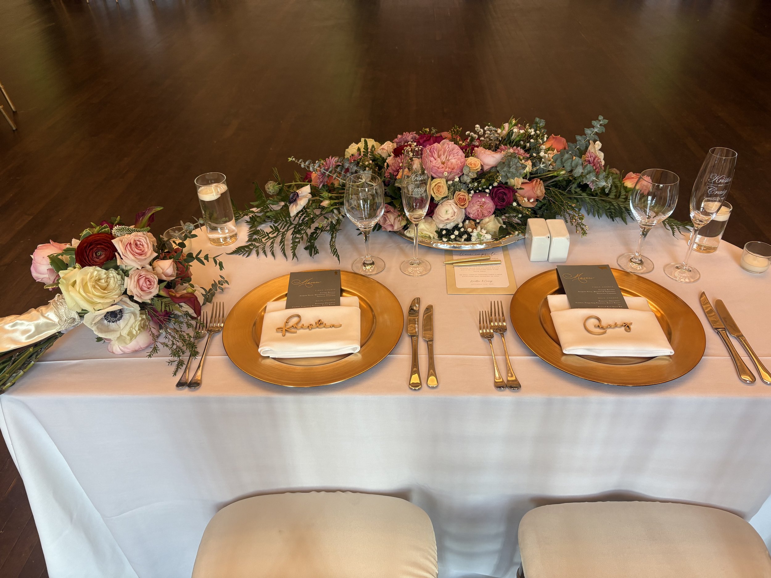 Light Purple Dahlias, Orange Roses, Magenta Roses, Orange-Pink Roses, White Roses, Light Pink Spray Roses, Scabiosa Pods, Baby’s Breath, Fern, and Eucalyptus.