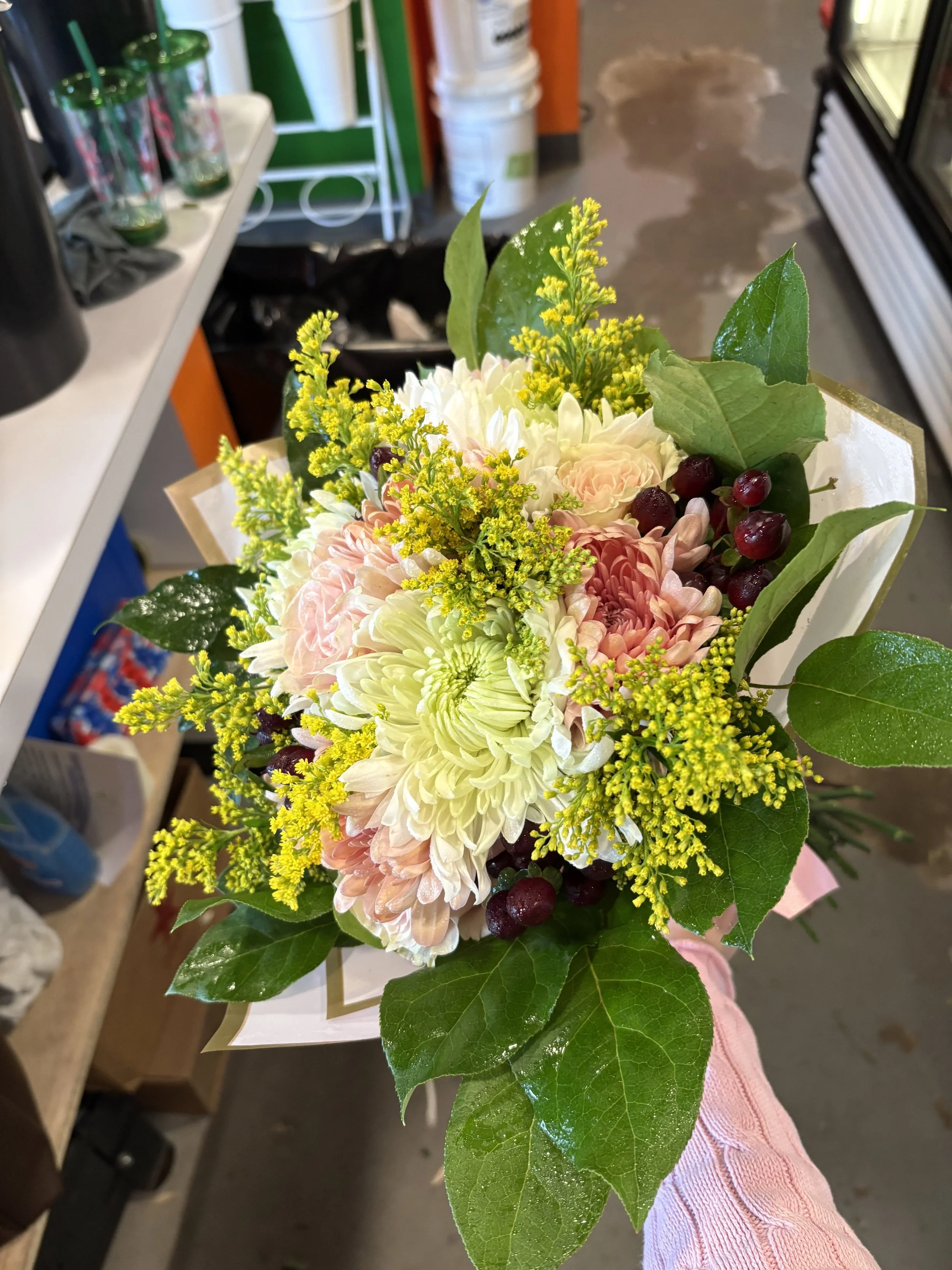 Just Because!Pink Chrysanthemum, White-Green Chrysanthemum, Solidago, Pink Rose, Maroon Hypericum Berry, and Salal Tips.