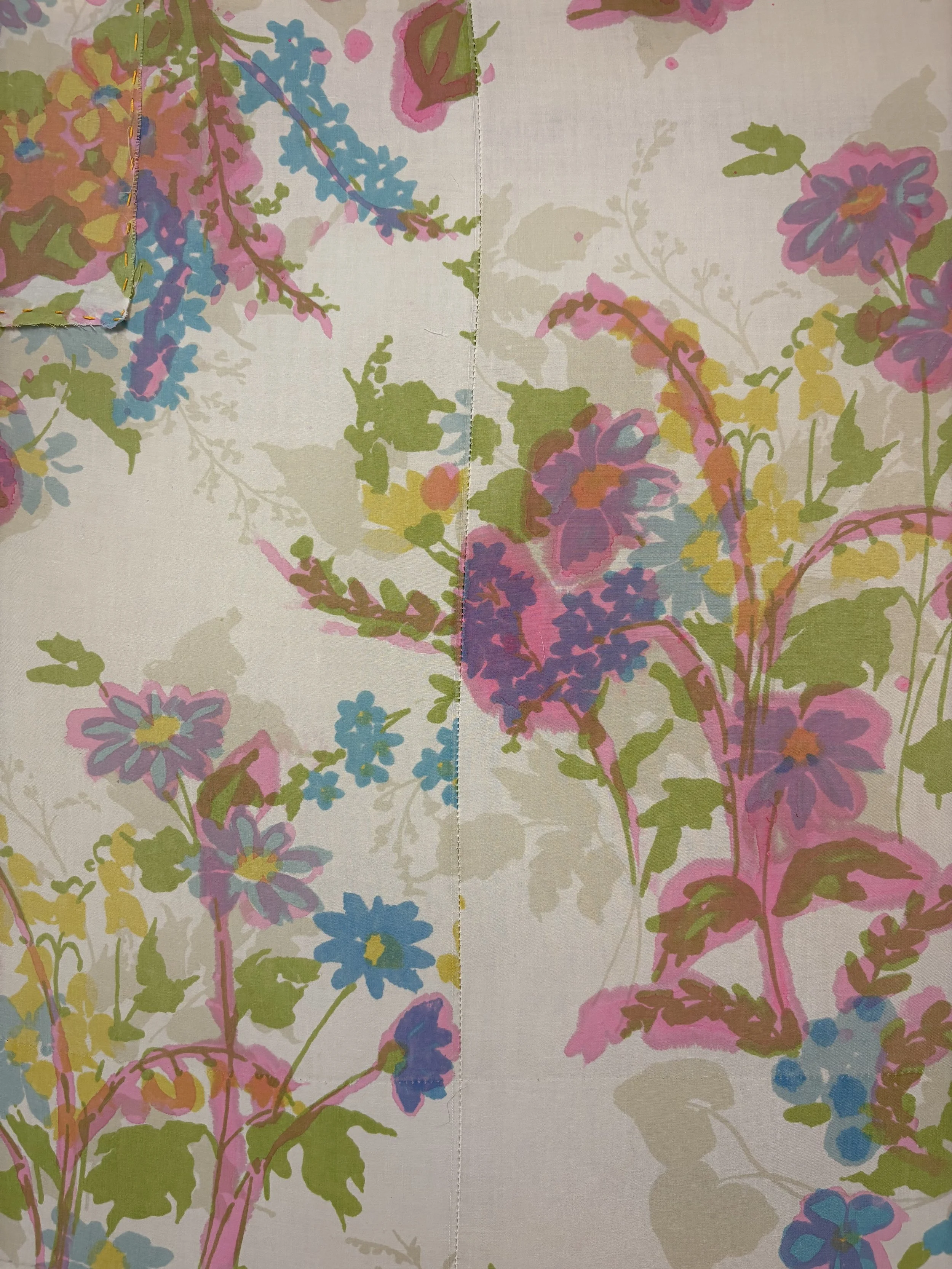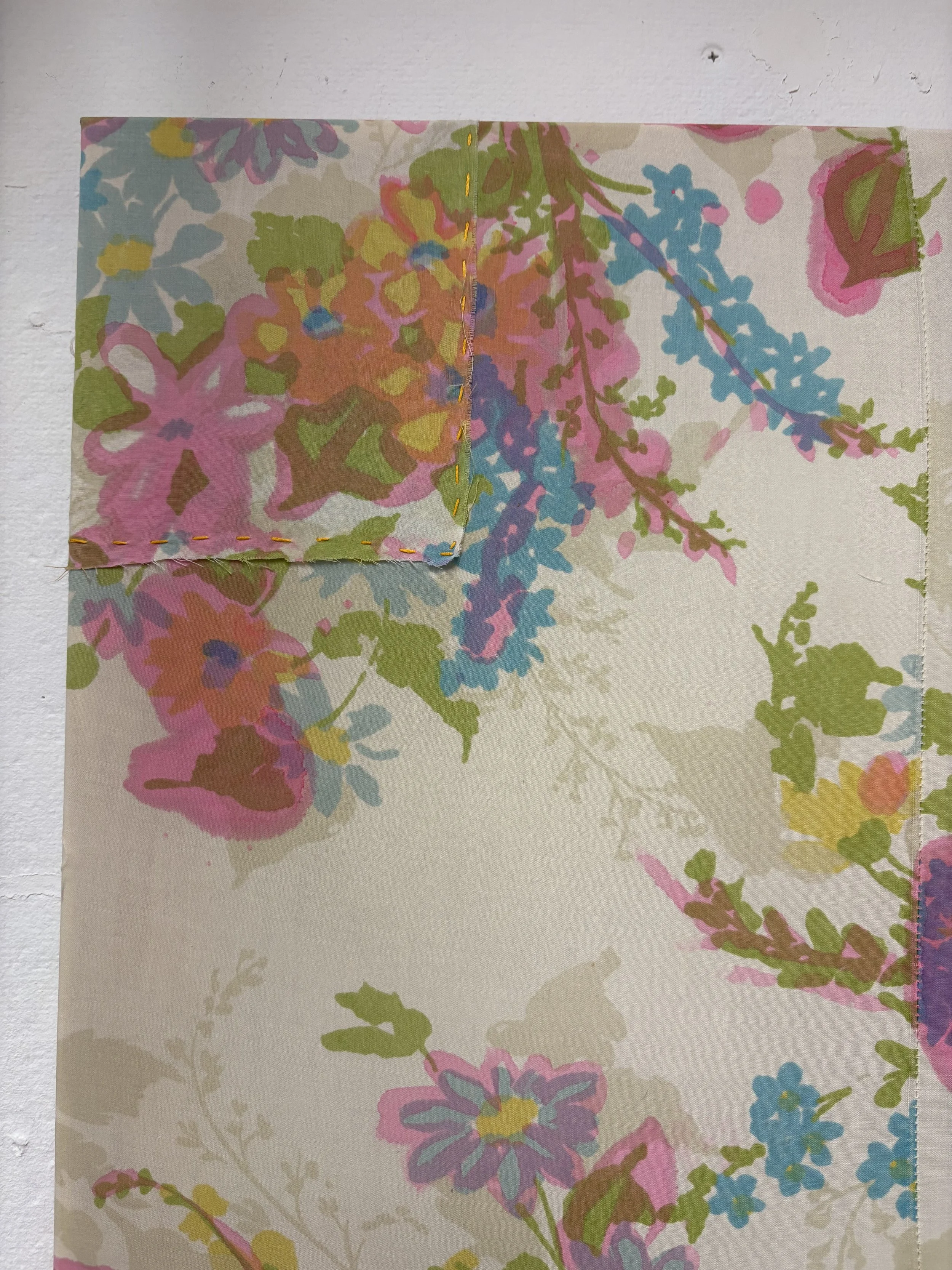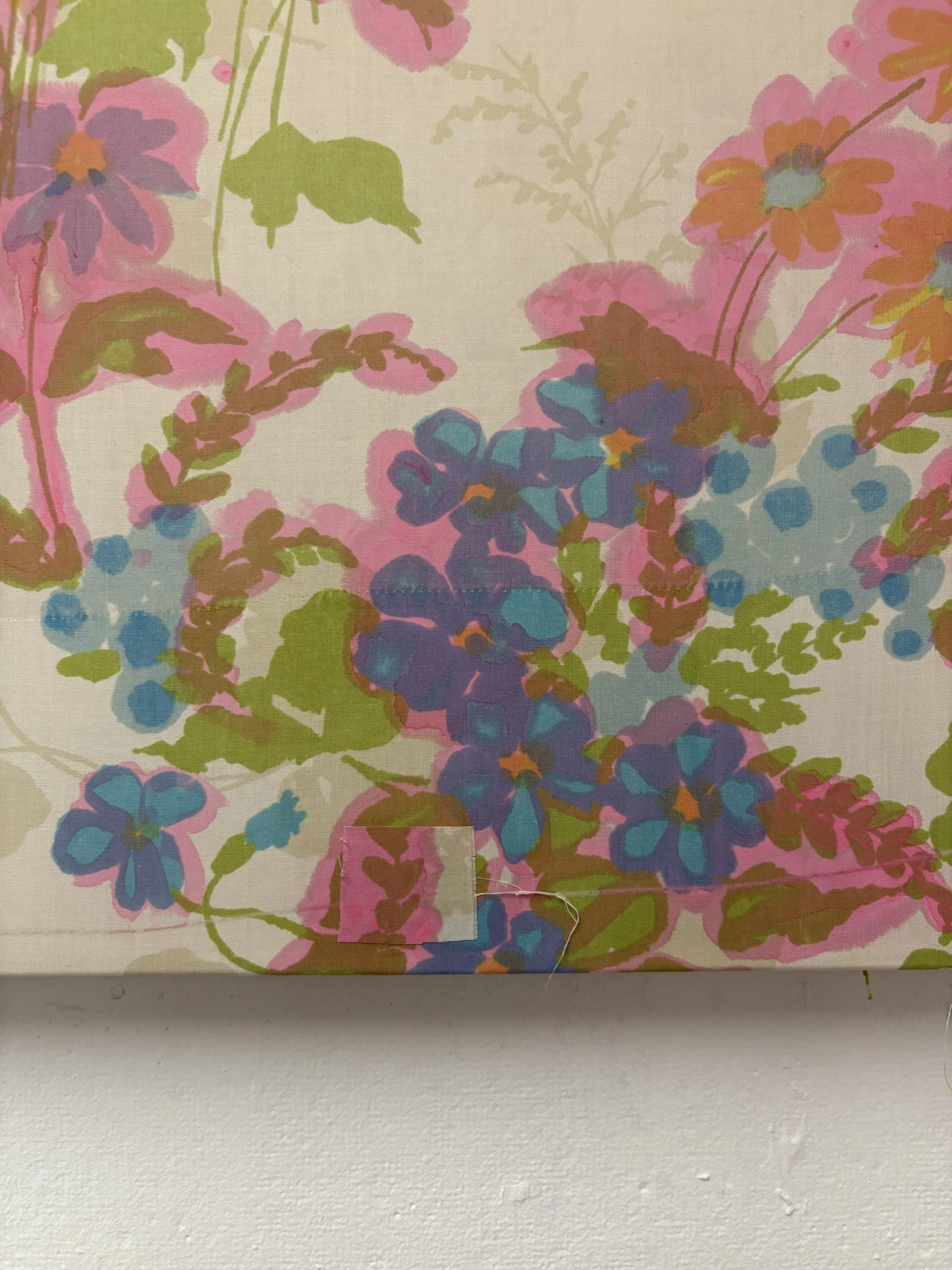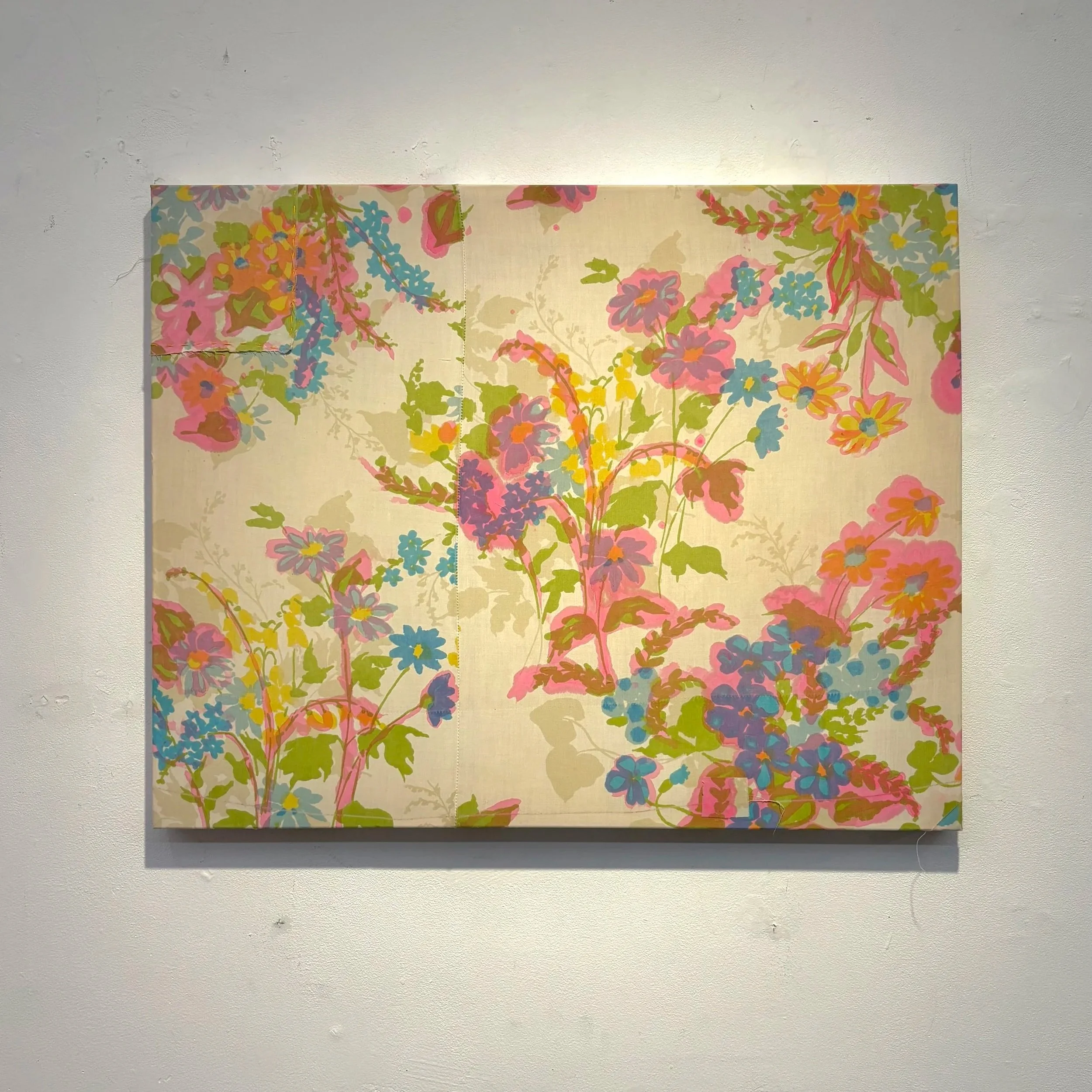 Textile Painting made with repurposed fabric, dye, and paint on canvas.