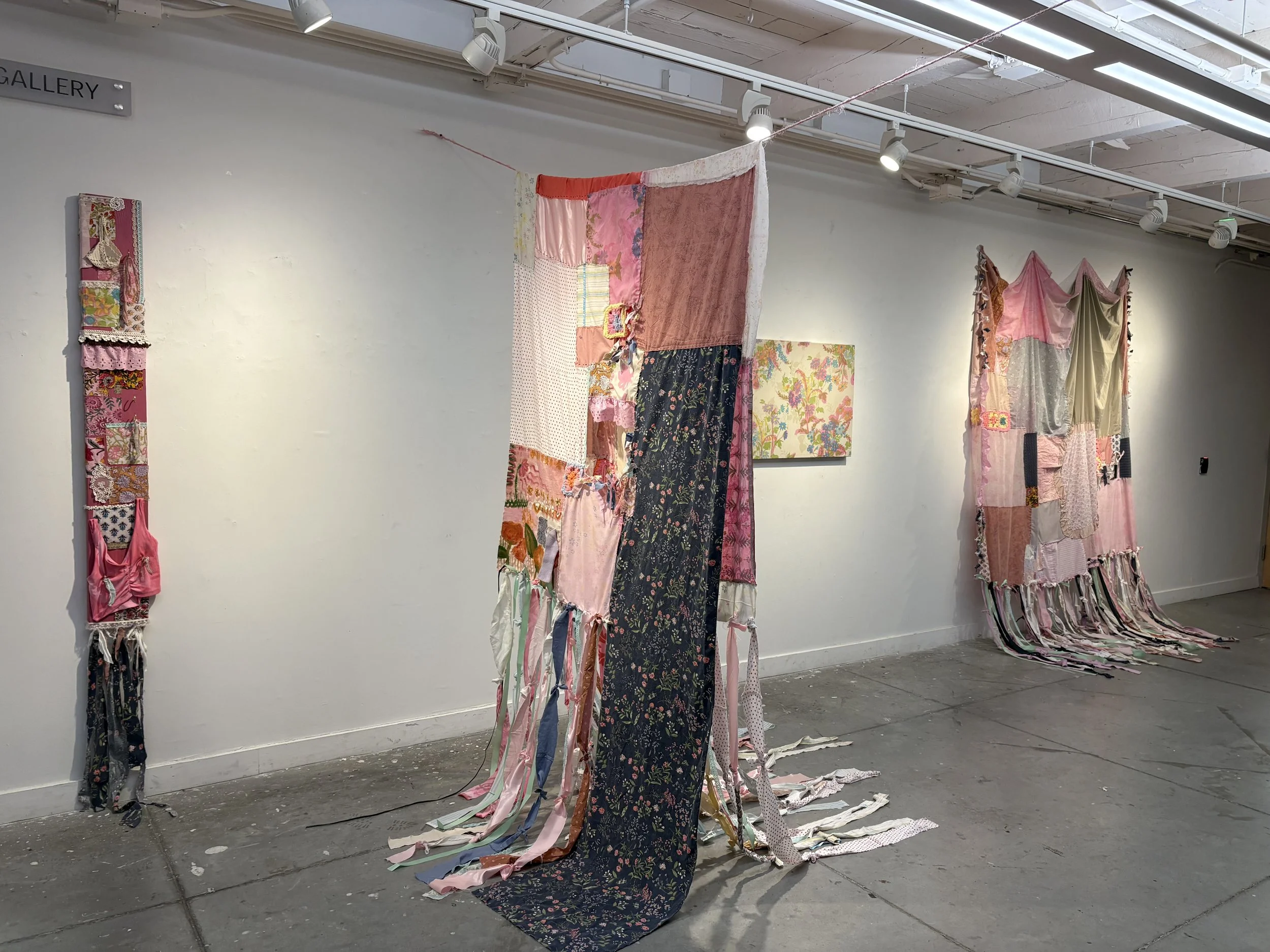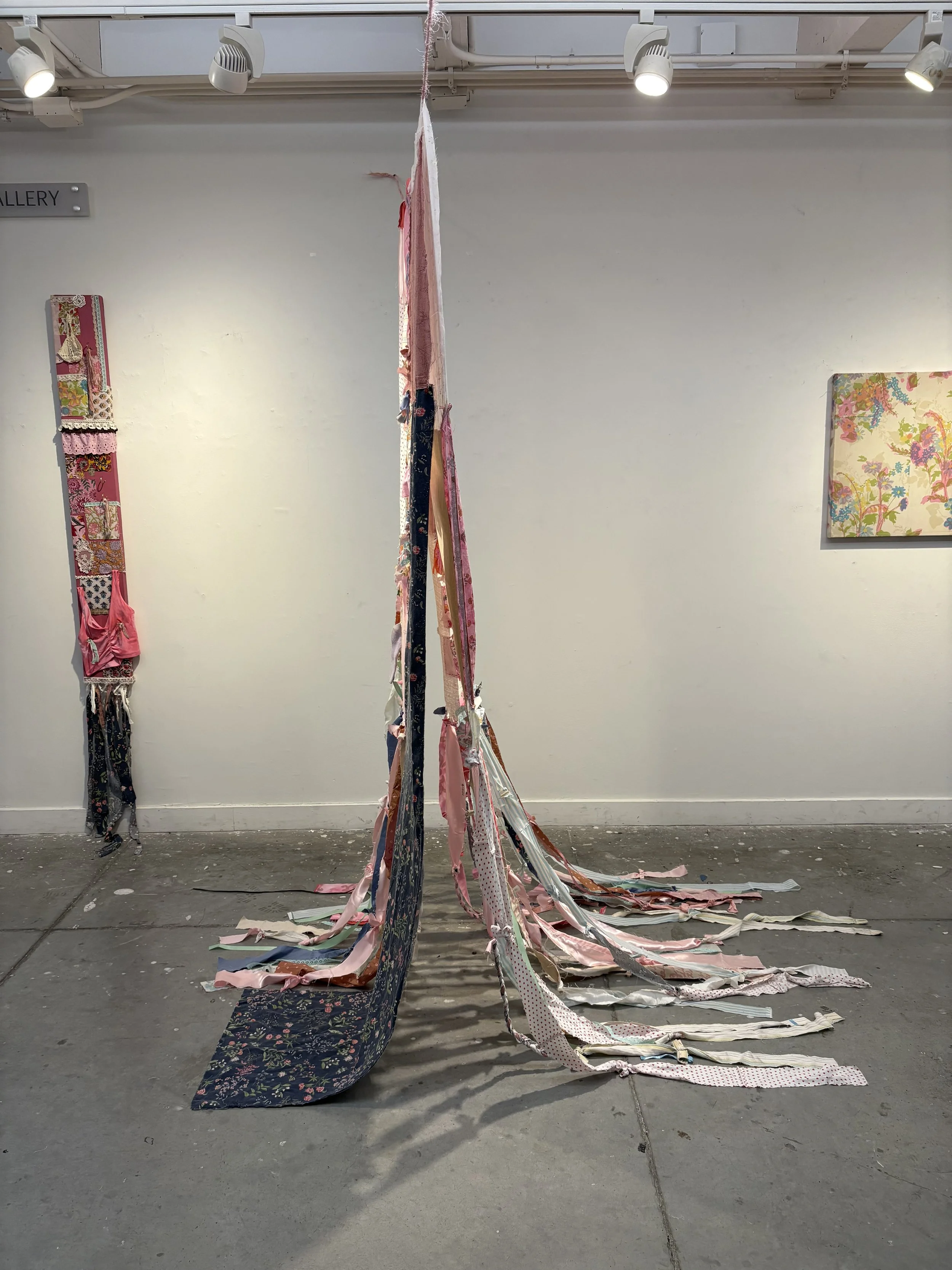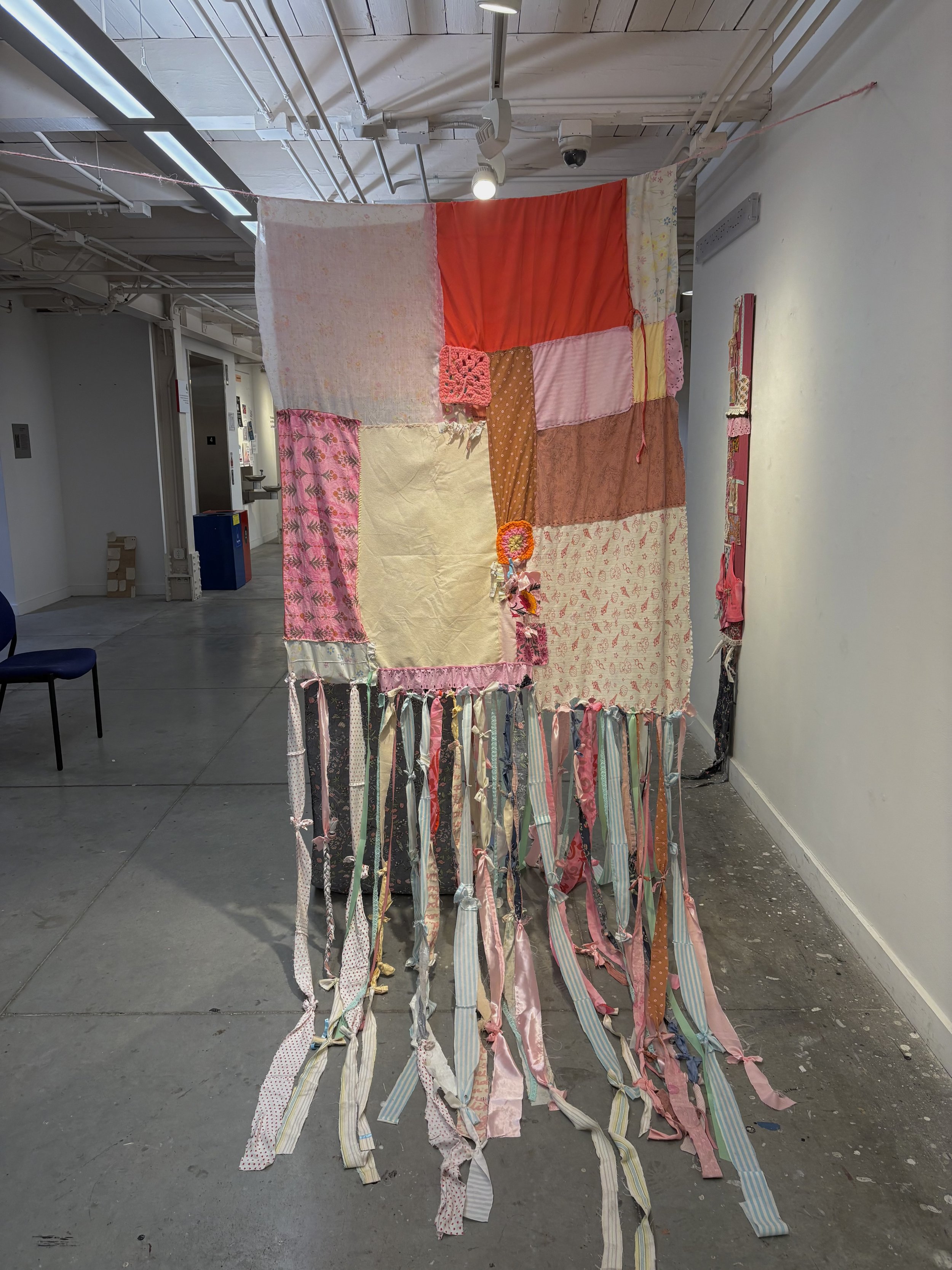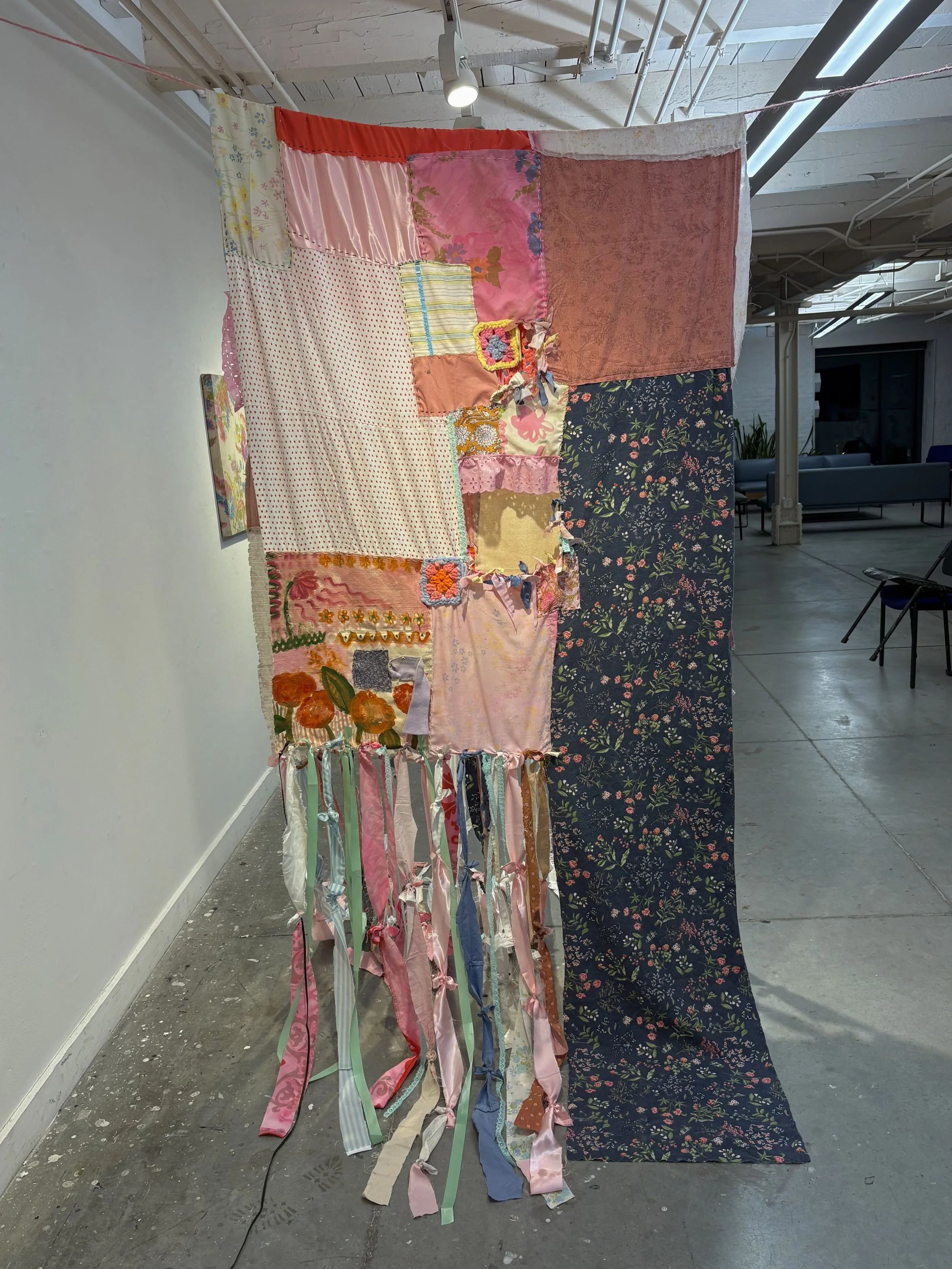 Textile Painting made with repurposed textiles and fabrics, yarn, ribbon, lace, dye, and paint.