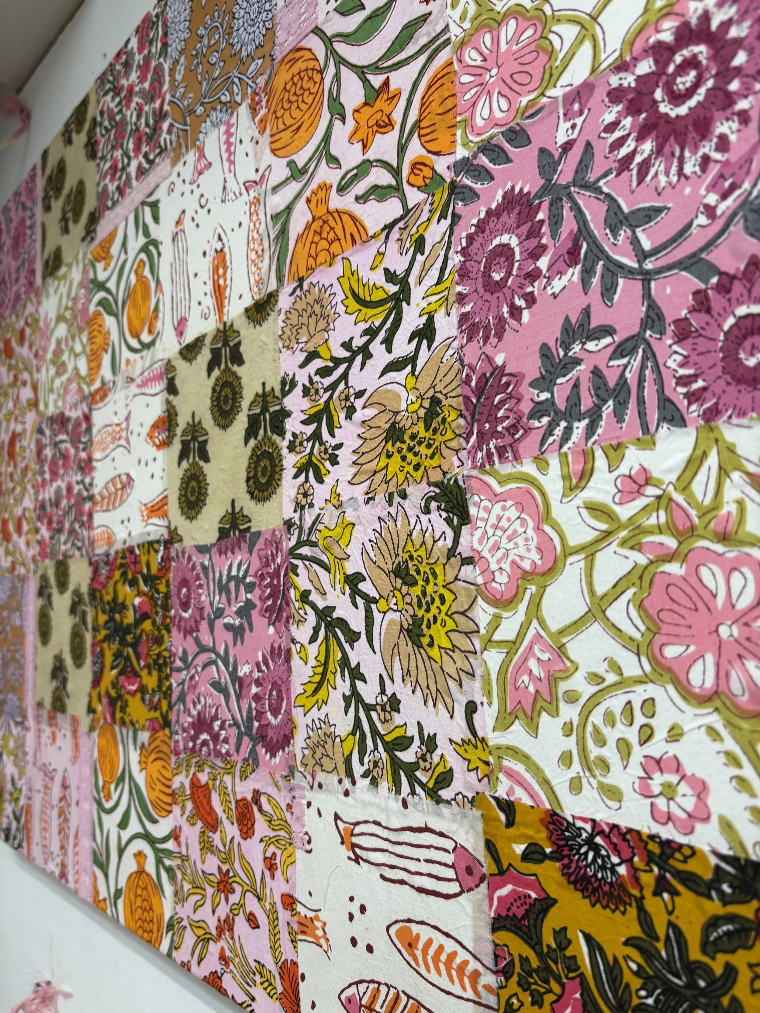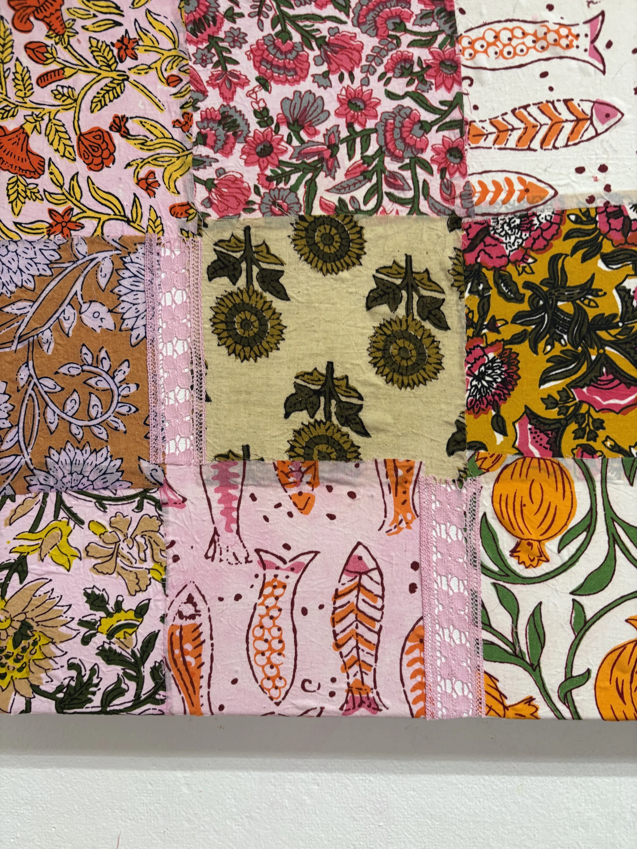 Textile Painting made with repurposed textiles, lace, and dye on linen.