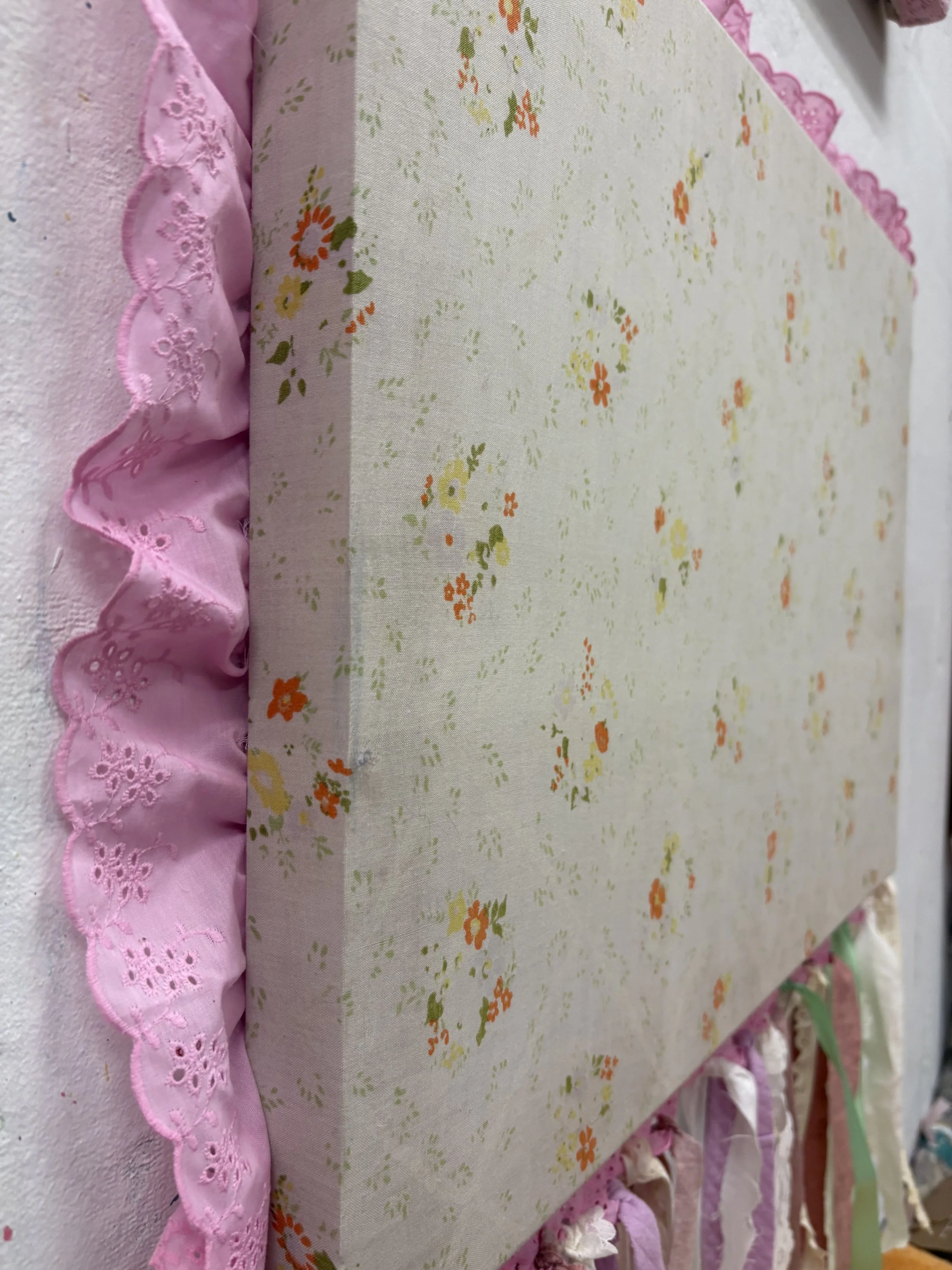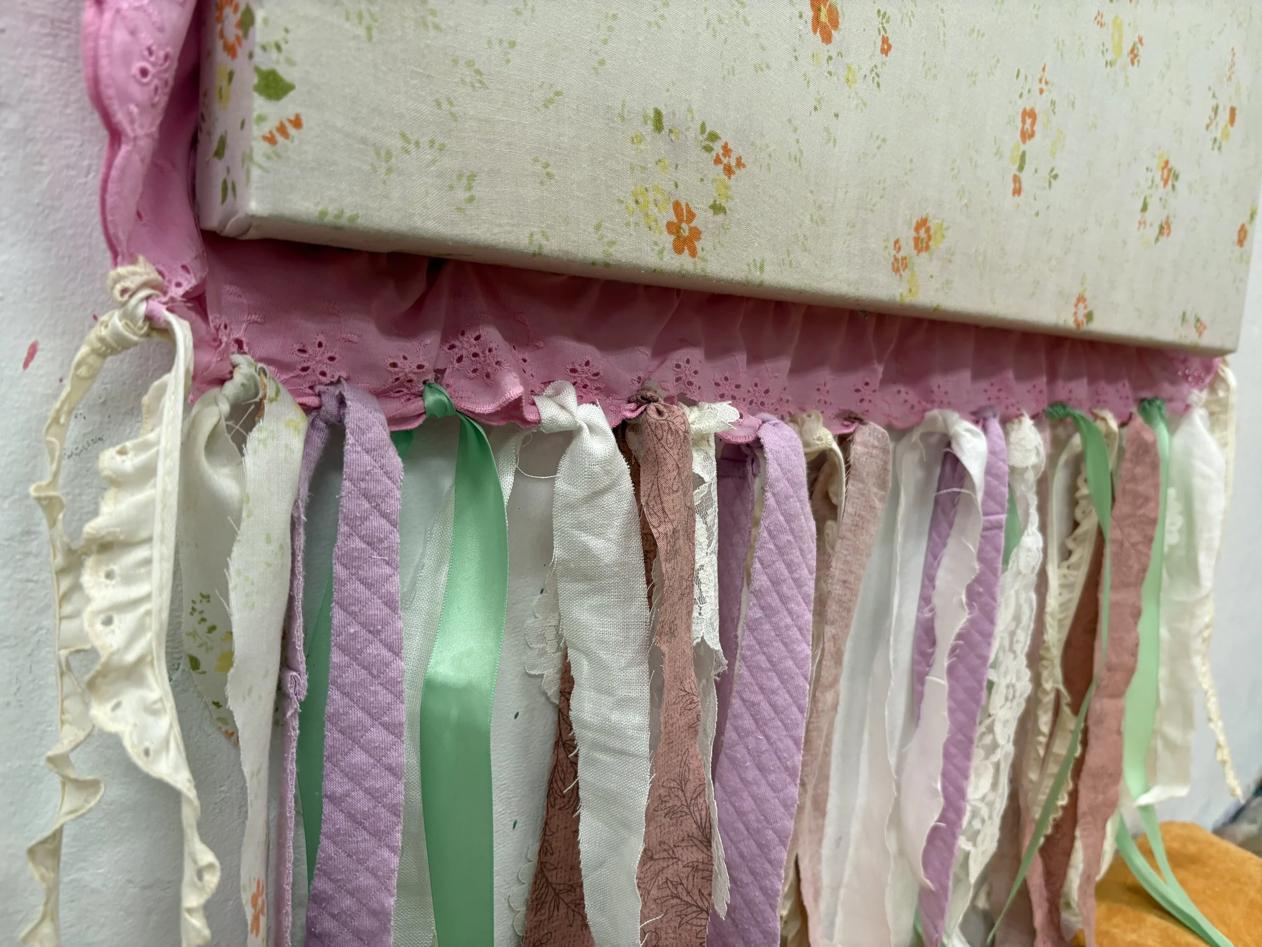 Textile Painting made with repurposed textiles and fabrics, ribbon, lace, and dye.