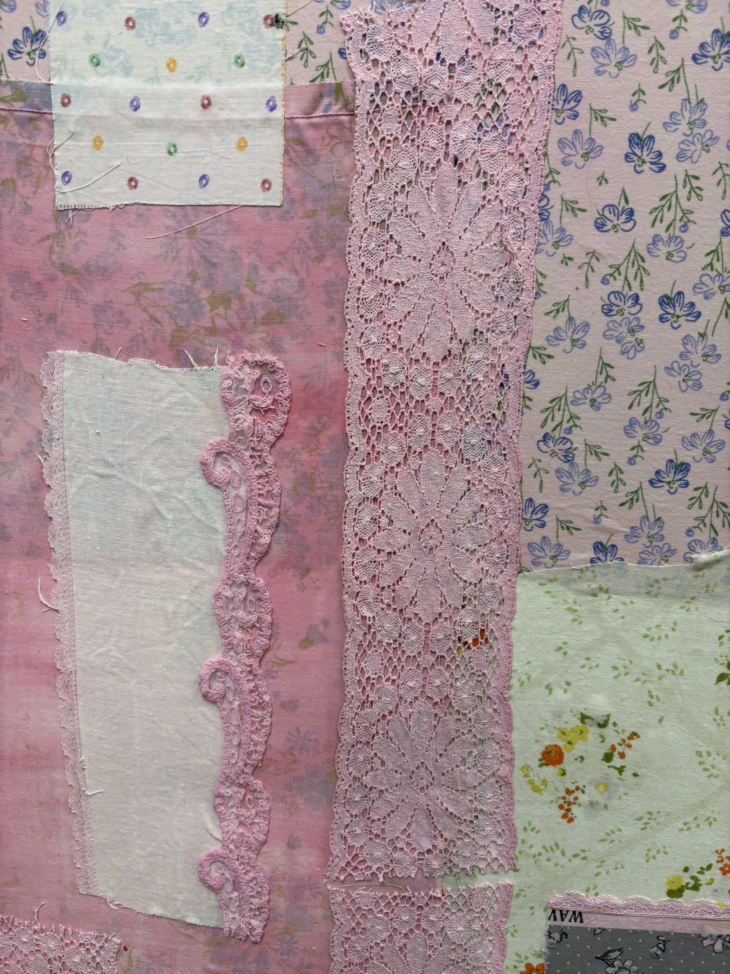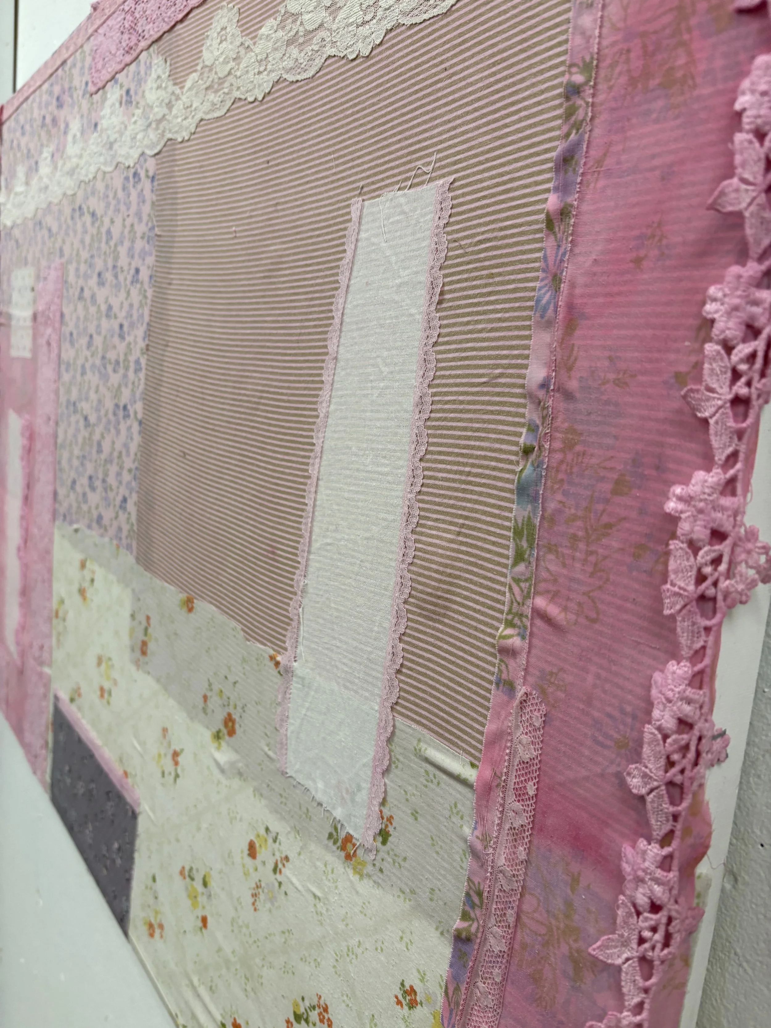 Textile Painting made with repurposed textiles and fabrics, ribbon, lace, and dye on canvas.